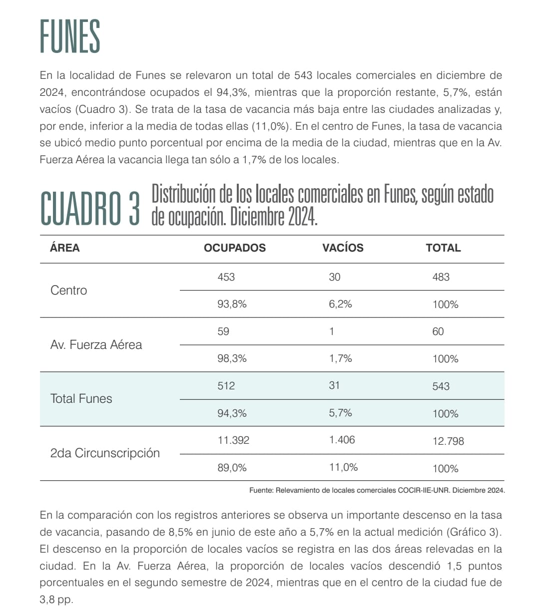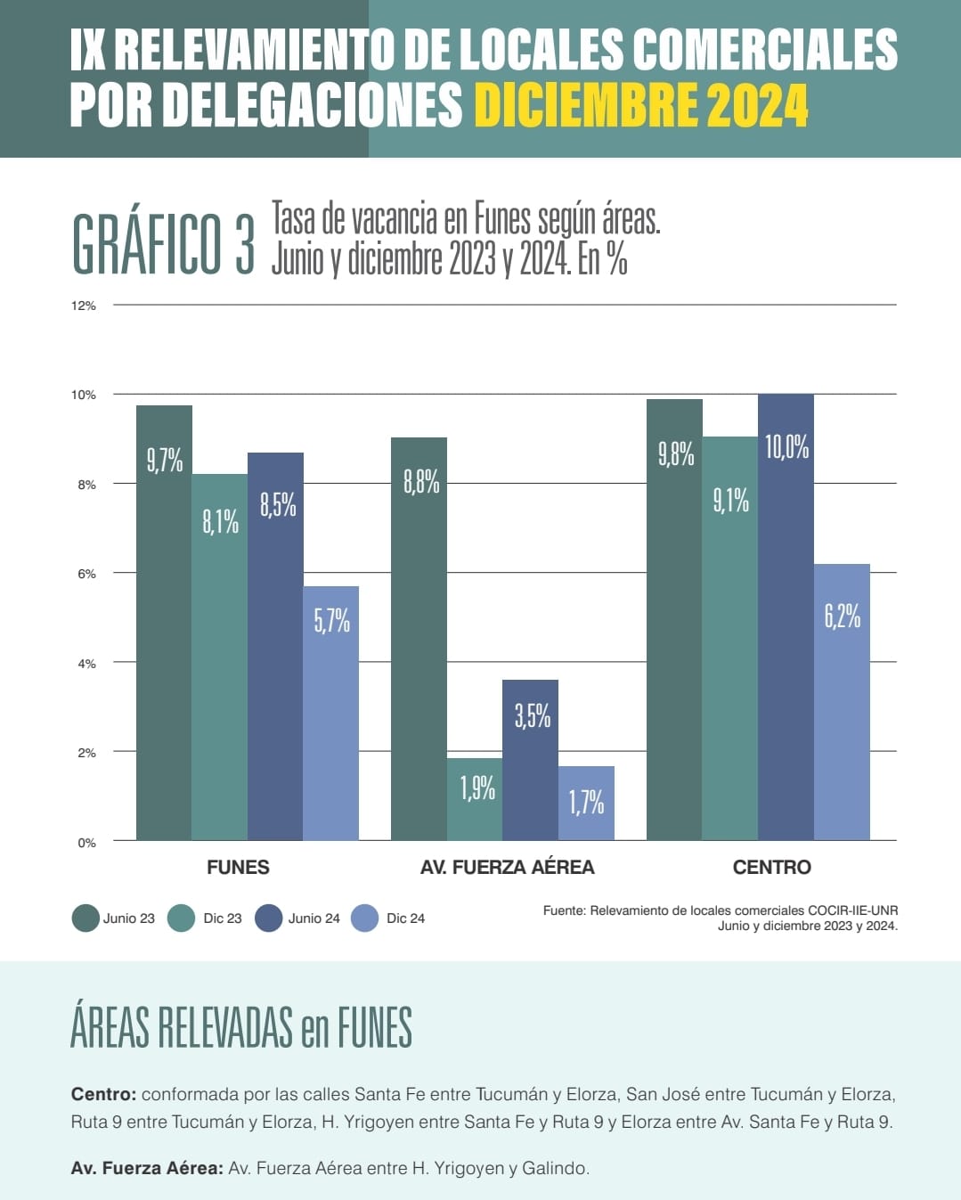 Dentro de las zonas evaluadas en Funes, las diferencias entre los sectores comerciales son notorias. En el área céntrica, comprendida por calles como Santa Fe, San José, Ruta 9 y Elorza, la vacancia se ubicó ligeramente por encima de la media de la ciudad, alcanzando el 6,2%. Aunque estas cifras siguen siendo positivas comparadas con otras localidades de la región, denotan un margen de mejora en esta zona específica.