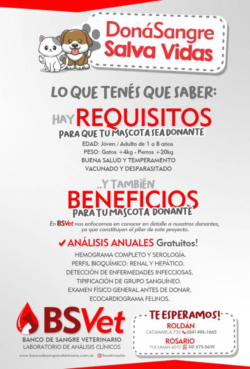 Además, explicó que el proceso de donación consiste en una primera muestra de sangre que será analizada por el equipo del banco en cuestión, para saber si el animal está en condiciones de donar o no. “Con esa muestra se puede saber mucho de la salud del animal. Si está todo okey, se avisa a su familia y concreta un turno en el que se hará la extracción para donar. Pero si el perro o gato tiene algún problema y no puede ser donante, su familia ya quedará con ese informe, lo cual es re importante saber, y de ahí en más sabrá cómo actuar para sanar y cuidar a su animal”.