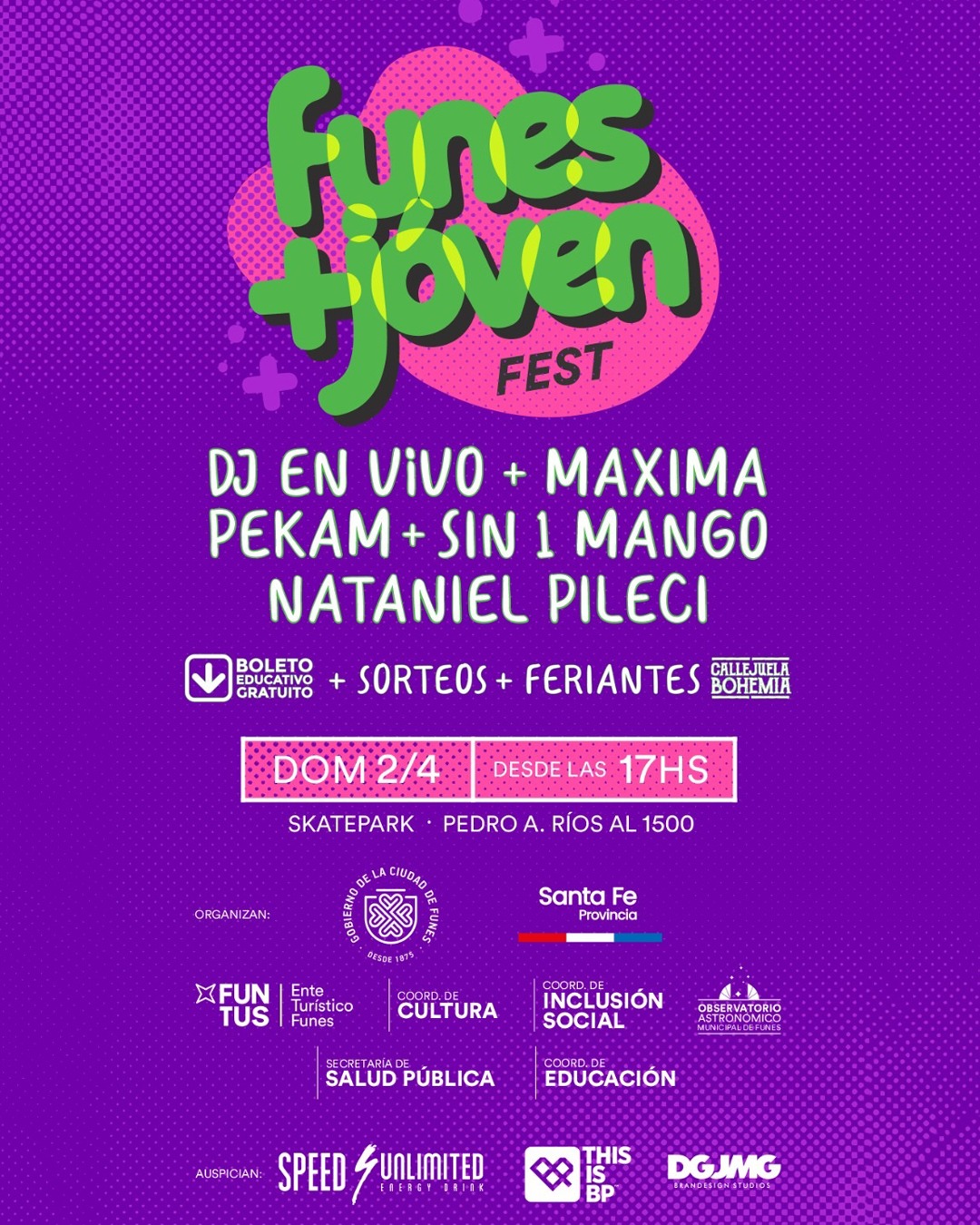 Este domingo a partir de las 17hs tendrá lugar en el skatepark "Funes + joven fest", una jornada integral destinada a jóvenes con música en vivo, competición de skate, sorteos y regalos y la presencia de feriantes de Callejuela Bohemia. Además, se podrán iniciar los trámites para el boleto educativo.