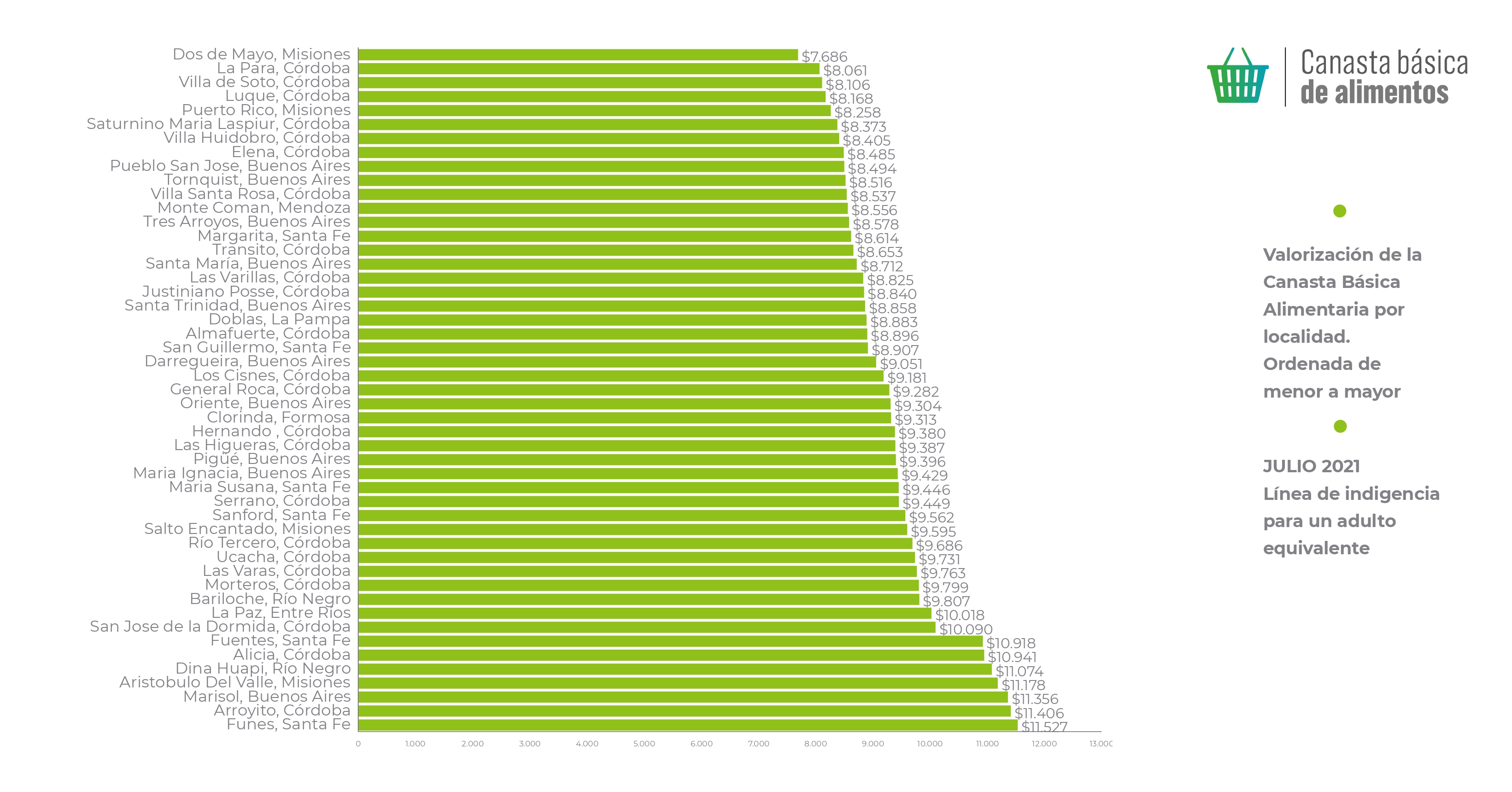En base a ese trabajo del que participaron 49 localidades de nueve provincias, se pudo determinar que en julio un adulto necesitó $9.316 para no cruzar la línea de indigencia. Ese valor se estableció tomando el promedio de las comunidades participantes. La CBA fue un 4% más elevada respecto a la presentada en junio y un 1,31% mayor que la publicada por el Instituto Nacional de Estadísticas y Censos (INDEC) ese mes.