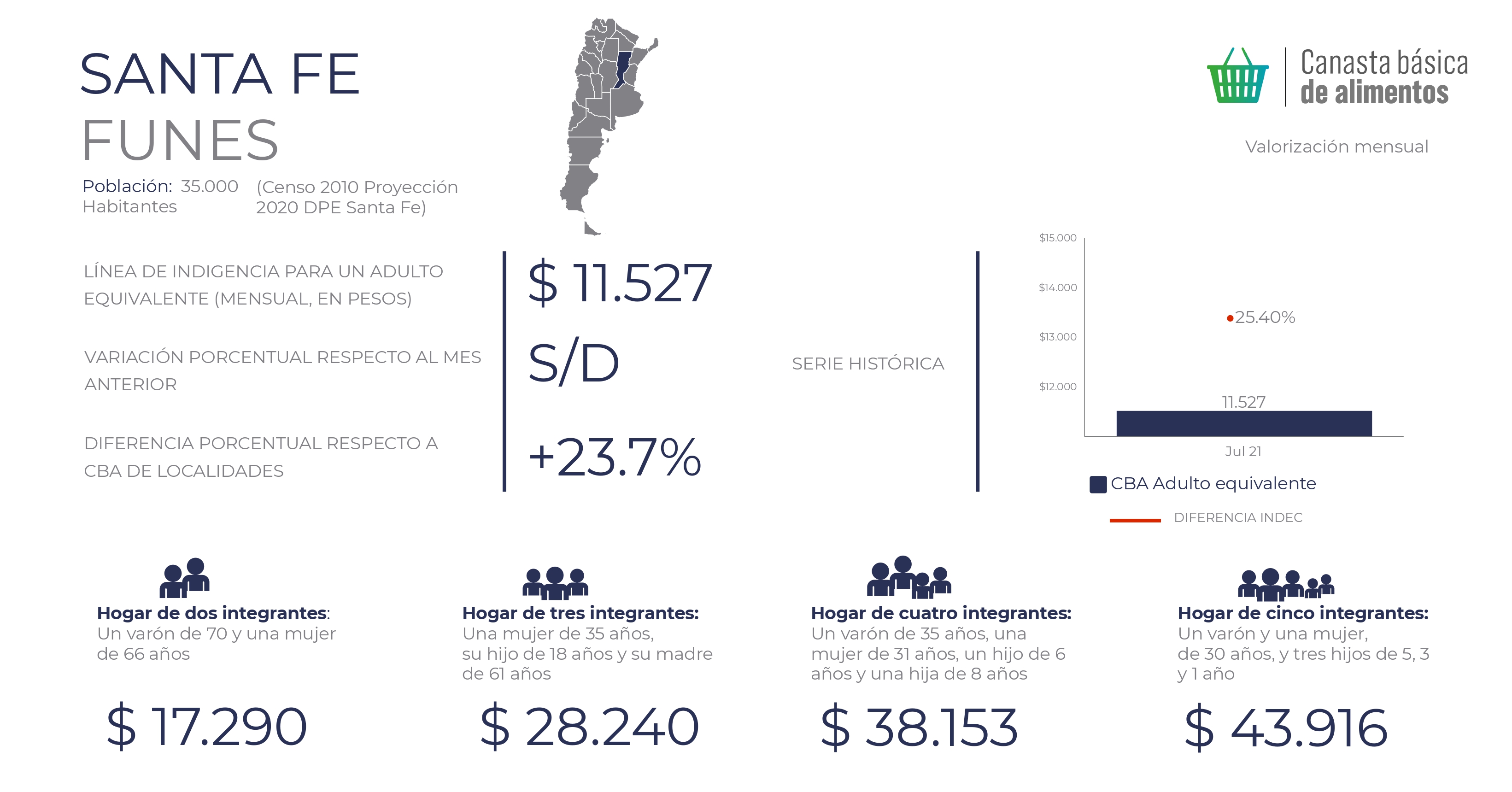 De acuerdo a la medición del mes de junio, una familia tipo funense necesitó 38.153 pesos para no caer por debajo de la línea de indigencia. El cálculo para un hogar de dos integrantes fue de 17.290 pesos, de tres integrantes, 28.240 pesos y de cinco integrantes, 43.916 pesos.