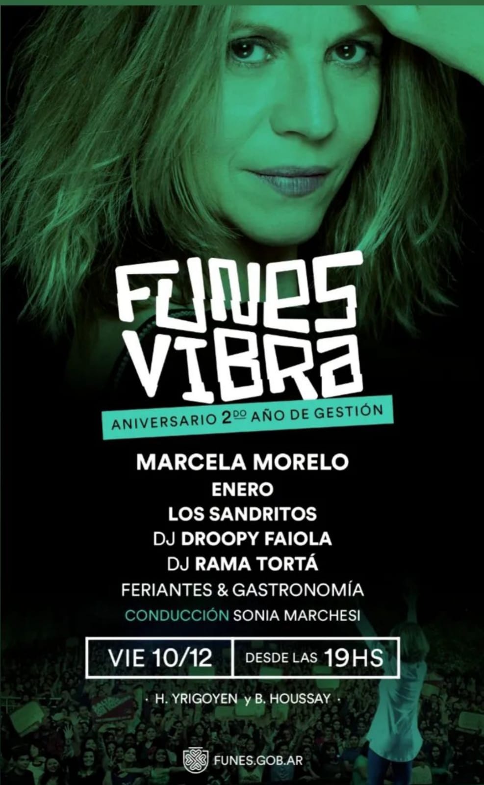 El Municipio celebrará el segundo año de gestión a lo grande. Con un evento denominado “Funes vibra”, se presentará de manera gratuita la cantante Marcela Morello junto a una extensa grilla de artistas y actividades.