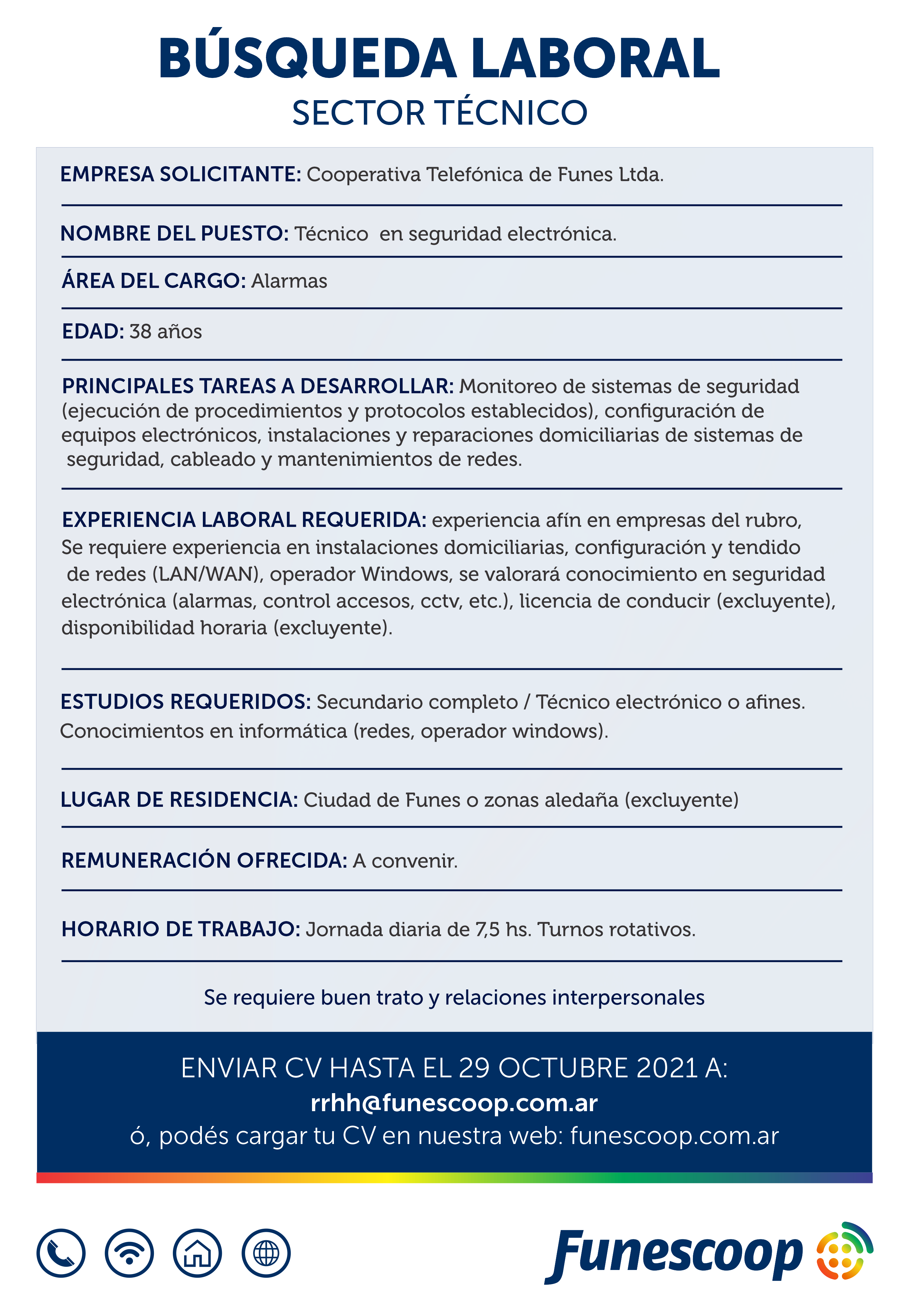 La cooperativa telefónica Funescoop lanzó una búsqueda laboral para el sector de alarmas. Estos son los detalles y requisitos para postular: