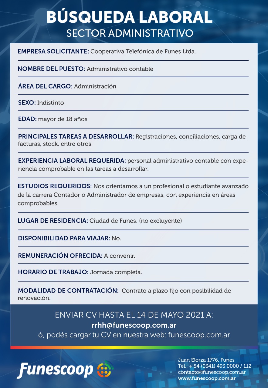 Funescoop lanza búsqueda laboral en el sector administrativo