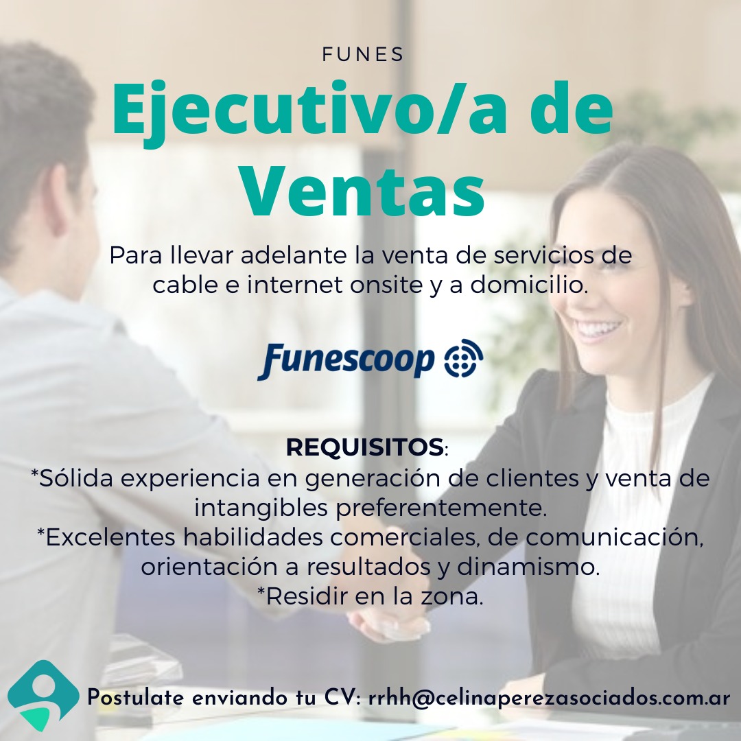 "Nos encontramos en la búsqueda de un Ejecutivo/a de Ventas para sumar al staff comercial de FunesCoop, la Cooperativa de Telecomunicaciones de Funes