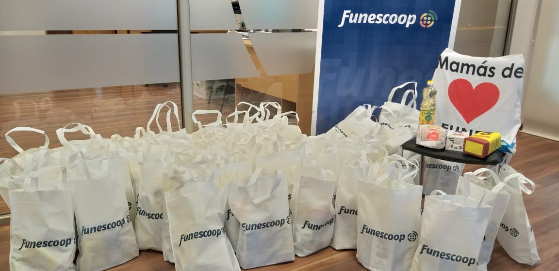 Esta mañana, representantes de Funescoop donaron al grupo Mamás del Corazón un total de 50 bolsones para ayudar a la tarea solidaria que realizan pensando en el bien de los decenas de chicos de la ciudad.