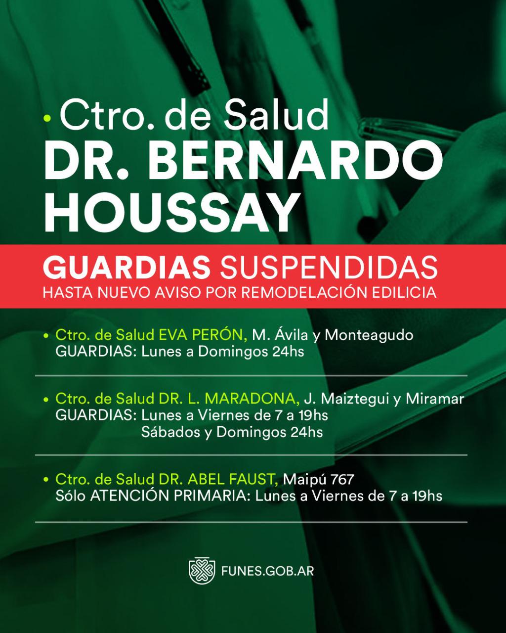 Las mejoras y remodelaciones del centro de Salud Dr. Bernardo Houssay hace un tiempo que se encuentran en marcha y desde el gobierno de la ciudad recuerdan que las guardias médicas se encuentran suspendidas “hasta nuevo aviso” y la atención médica se traslada a los otros tres centros.