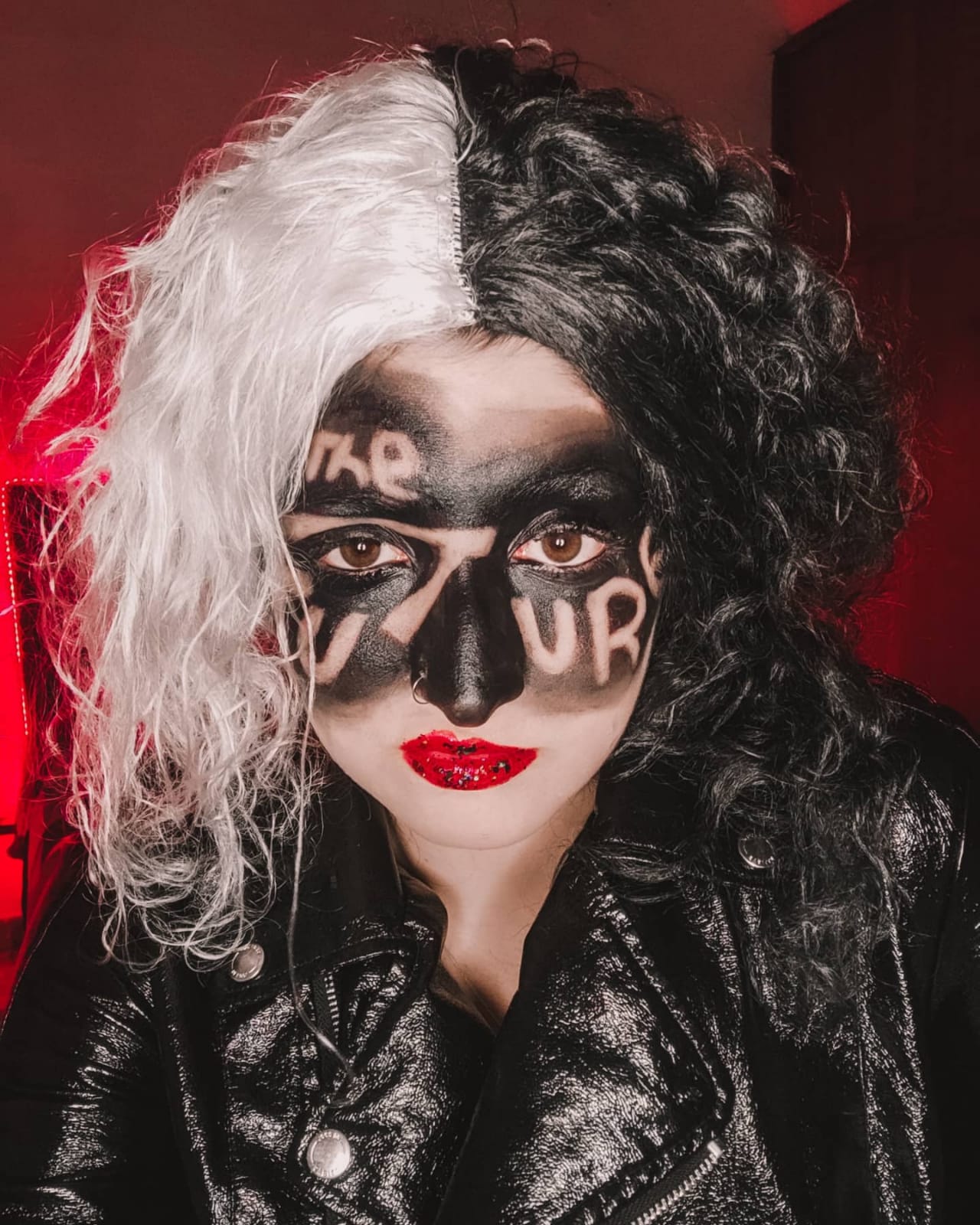 Para esta propuesta de Halloween, la maquilladora Rocío Baio, decidió inspirarse en Cruella ya que al ver el film se dio cuenta que cada look que ella vestía para desafiar a la famosa diseñadora, iba acompañado de un maquillaje igual de sorprendente que completaba esa vestimenta rebelde que se quiere mostrar en la película.