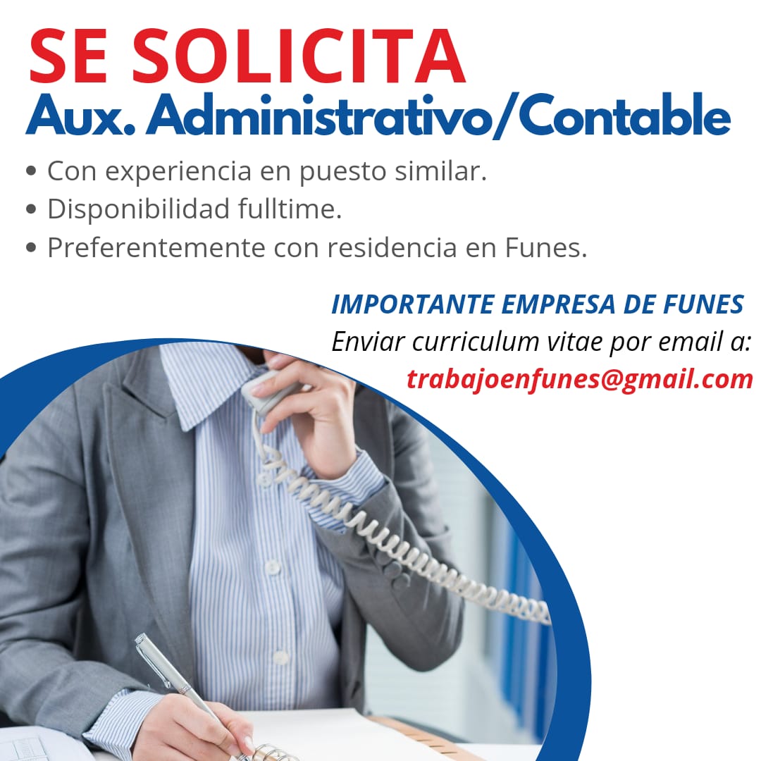 La búsqueda remite específicamente a "auxiliar administrativo / contable" y pide disponibilidad full time. Más información en la nota.