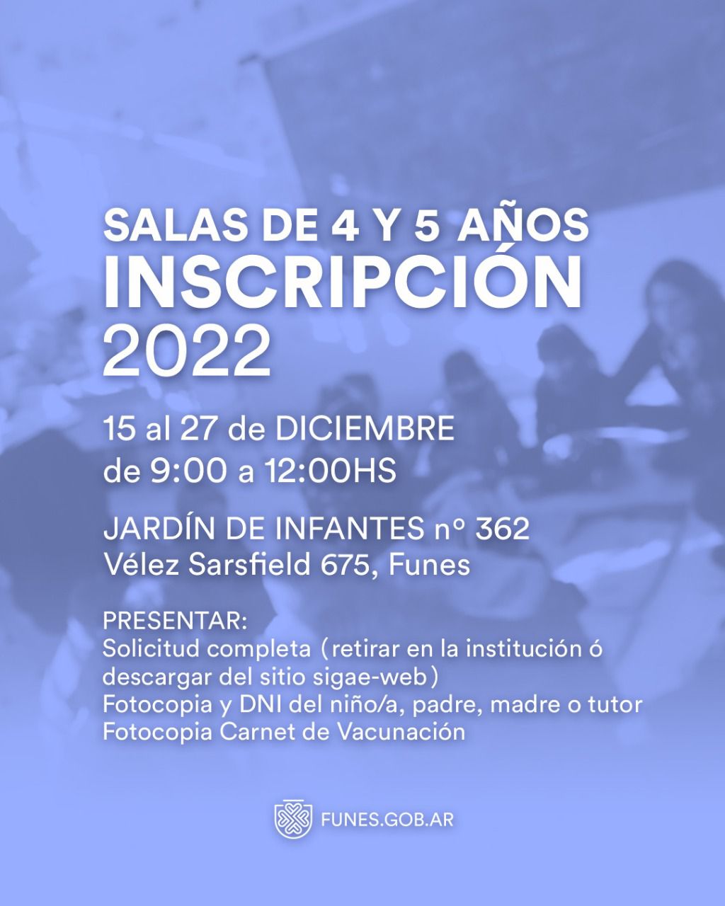 El Gobierno de Funes informó que a partir de este miércoles 15 y hasta el lunes 27 de diciembre se encontrará abierta la inscripción para el Jardín de Infantes N° 362, que se encuentra ubicado en calle Vélez Sarsfield 675.