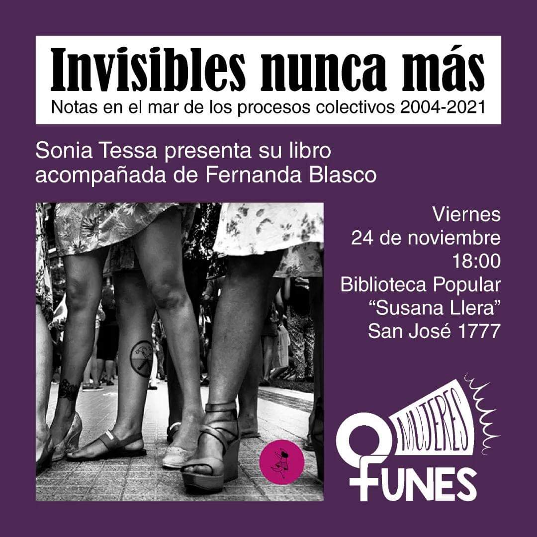 Invisibles nunca más. Notas en el mar de los procesos colectivo 2004-2021 es el título del libro que escribió la periodista feminista Sonia Tessa y que presentará este viernes, desde las 18, en la Biblioteca popular Susana Llera (San José 1777), con entrada gratuita. A Tessa la acompañará la periodista Fernanda Blasco, y juntas hablarán sobre los derechos ganados en estos años, el peligro de perder espacios ante el nuevo gobierno liderado por Javier Milei y qué se puede hacer para seguir en alerta.
