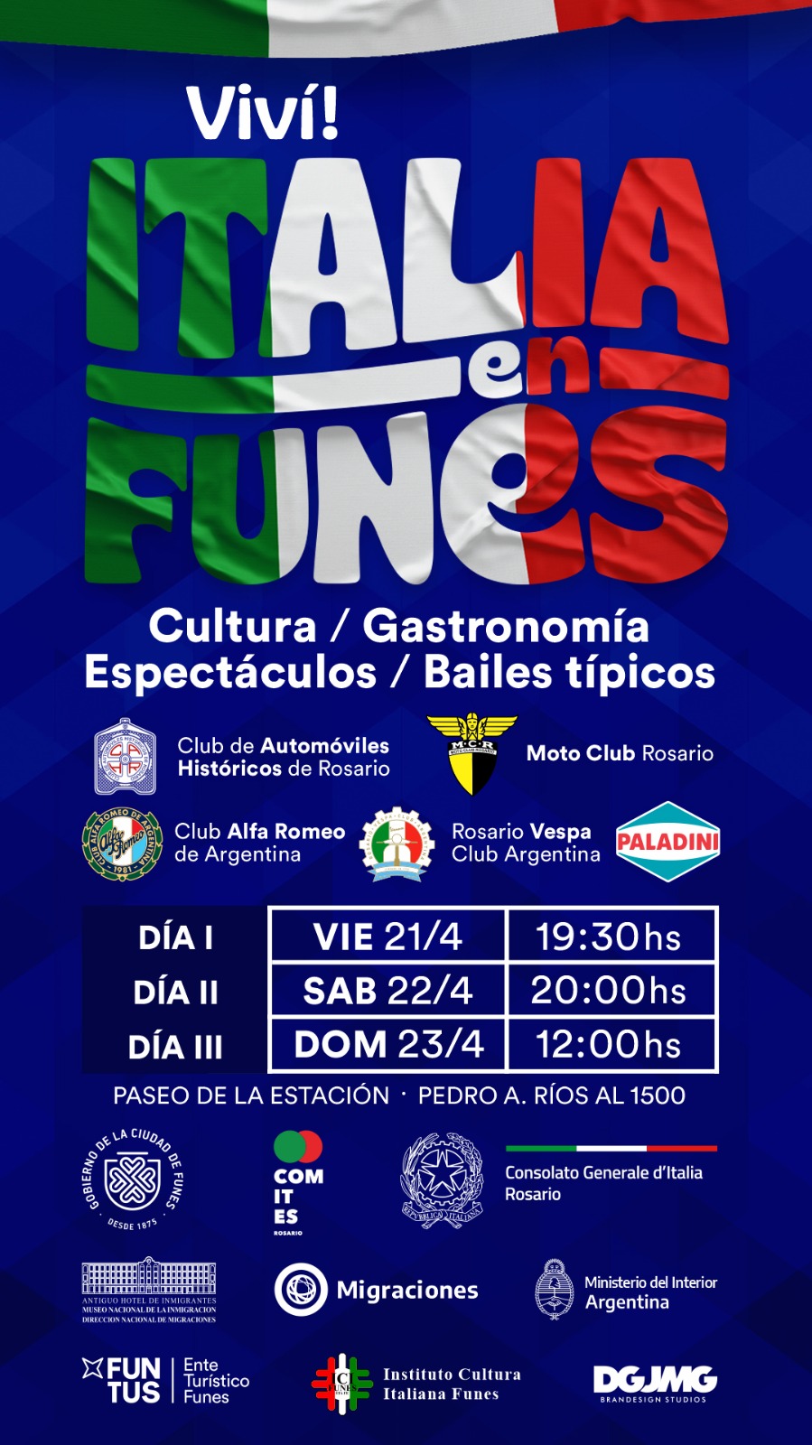 “Viví Italia en Funes” se llevará a cabo los días viernes 21, sábado 22 y domingo 23 de abril en el Paseo de la Estación, ubicado en Pedro A. Ríos al 1500. Se trata de un evento organizado por el Gobierno de Funes junto al COM.IT.ES Rosario. También cuenta con el apoyo del Consulado Italiano de Rosario, el Ministerio del Interior a través de la Dirección General de Migraciones y el Ente Turístico de Funes.
