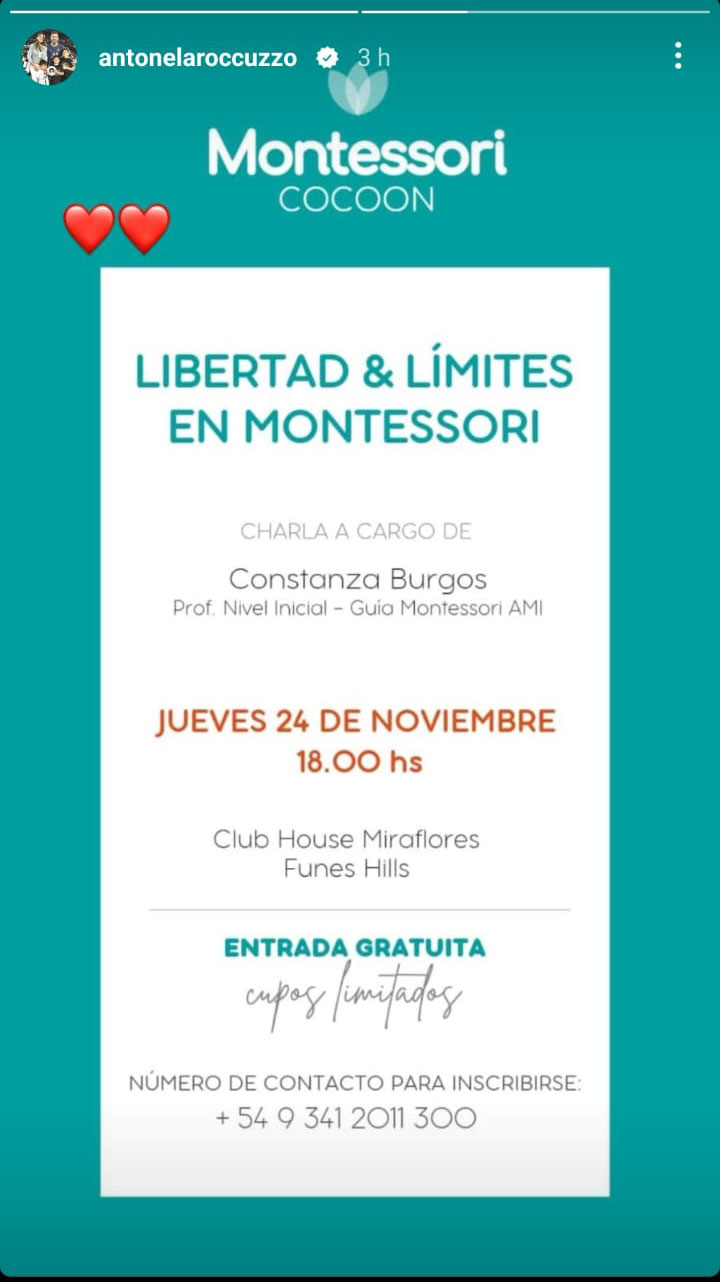 "Libertad y Límites en Montessori" es el título de la charla que se realizará este jueves en la ciudad de Funes, de las 19 horas en el Club House de Miraflores, Funes Hill. El encuentro fue promocionado por la propia Antonella Rocuzzo en su perfil de Instagram, luego de que InfoFunes confirmara a modo de primicia la semana pasada que la esposa de Lionel Messi planea abrir un colegio con ese perfil en la ciudad.