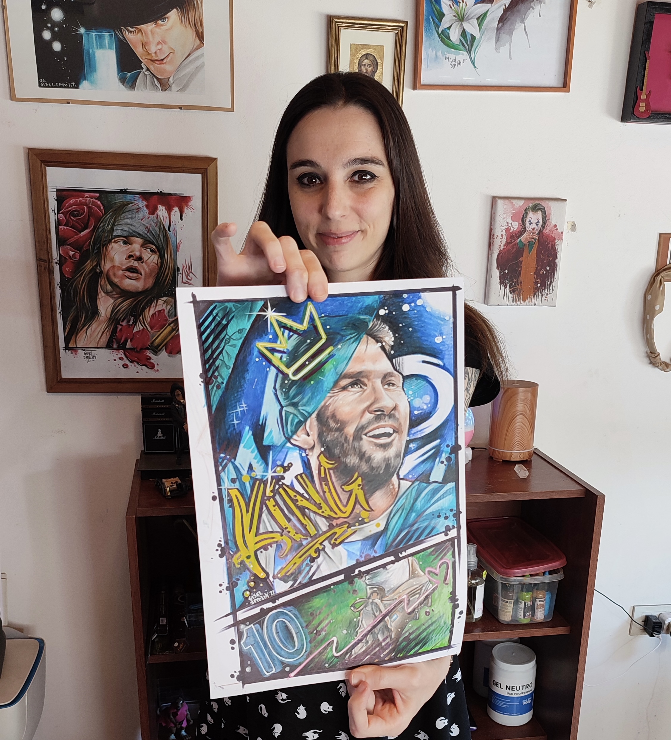“Básicamente dibujo como manera de expresión, siempre me ha costado mucho hablar, expresarme, como nos pasa a un montón de personas, pero a través del dibujo trato de hacerlo como canal de expresión, más allá de que el dibujo guste o no. Es una necesidad”, expresó quien en diciembre se sumó a los festejos por la tercera Copa Mundial dibujando a un Lionel Messi coronado como rey. “Con el dibujo de Messi justo estaba pasando por un momento personal difícil a nivel profesional y Messi transmite mucho el no rendirse, lo cual me inspiró un montón. En cuanto al dibujo de Fito me impactó mucho la relación de su familia en la serie. Yo también tuve una relación muy, pero muy cercana con mis abuelas y tías, y justo estoy en una etapa de cambios, de replanteos, de emociones a flor de piel y ahí hablaron mis lápices”,