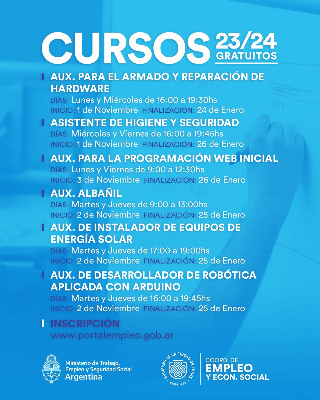 Los cupos son limitados, y la inscripción está abierta a todos los interesados. Para obtener más información sobre los cursos y para inscribirse, los solicitantes pueden dirigirse a la oficina de la Coordinación de Empleo y Economía Social, de lunes a viernes, de 8 a 12.