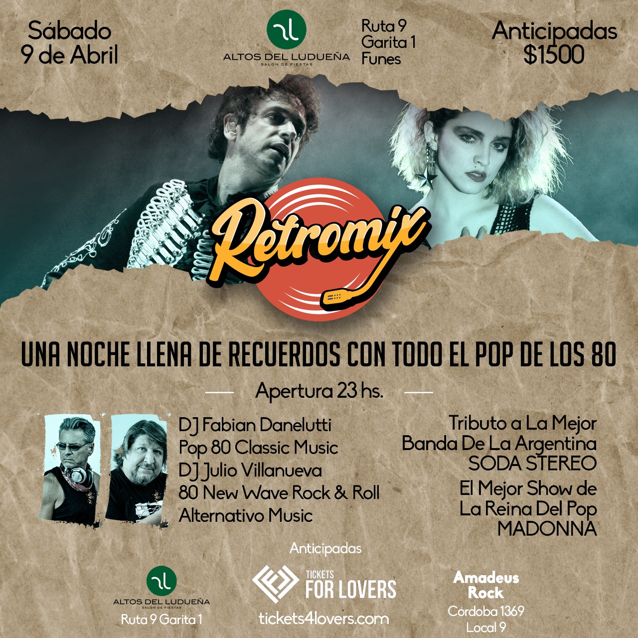 Una fiesta distinta llega a Funes, RetroMix un evento para recordar lo mejor de la música de los 80 y disfrutar una noche llena de recuerdos. La misma tendrá lugar en el salón Altos del Ludueña el sábado 9 de abril y está dirigida para mayores de 30 años.