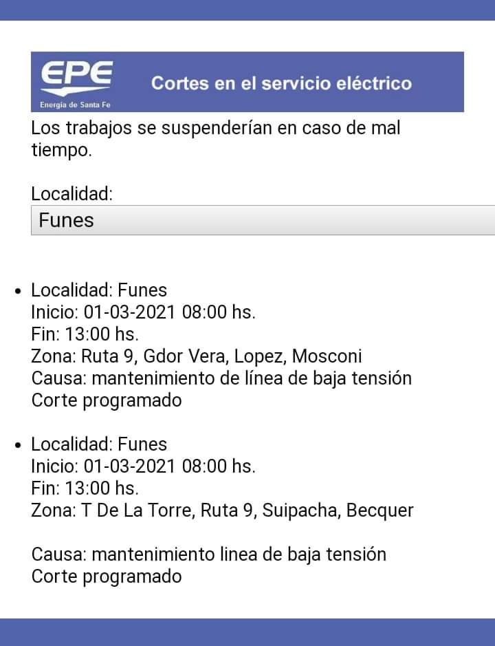 La Empresa Provincial de la Energía anticipó una necesaria suspensión del servicio eléctrico en la red de media tensión para realizar trabajos de mejoras y mantenimiento de la red de media tensión de Funes este día lunes.