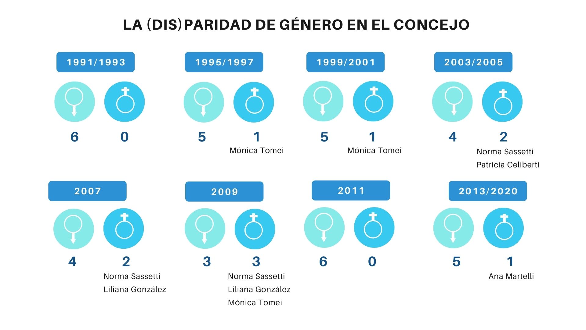 Entre 1991 y 1995, no hubo mujeres en el legislativo local. Sólo entre 2009 y 2011 hubo paridad en las bancas, pero en el siguiente recambio, los seis ediles fueron todos varones. En los últimos 7 años, sólo una mujer accedió al Concejo.