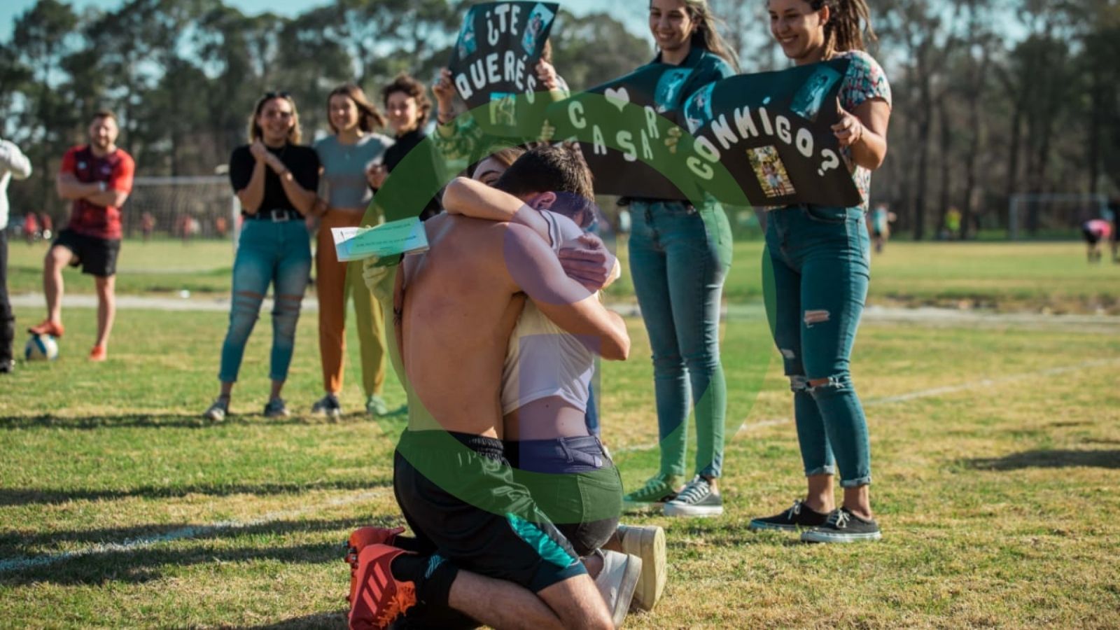 Y a su alrededor está Rocío, su novia, arrodillada con una pequeña caja con alianzas en su mano, rodeada de tres amigas que sostienen tres carteles que dicen TE QUERES CASAR CONMIGO. Franco se emociona, se saca su camiseta, se arrodilla para abrazar y besar a la chica y decirle que sí. Todos aplauden.