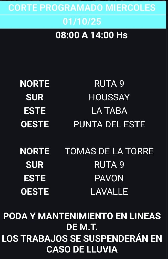 Uno de los sectores que estará sin servicio esas seis horas será el comprendido por las calles Punta del Este, La Taba, Houssay y Ruta 9. En tanto, también se harán dichos trabajos y corte del servicio durante los mismos en la zona comprendida por las calles Tomás de la Torre, Pavón, Lavalle y Ruta 9.