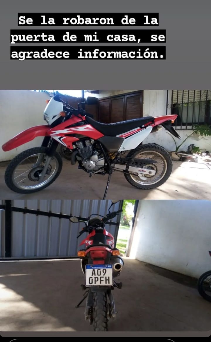 “A la 1.30 de la mañana salgo a sacar a mi perra un rato como todas las noches, y de paso trabé el portón del garage que está todo techado y cerrado y es donde guardamos las motos y el auto. Cerca de las 6 de la mañana, la perra que duerme conmigo se despertó y salió corriendo contra una de las ventanas a ladrar, pero yo pensé que era uno de mis hijos que llegaban y abrían el portón, después la perra se calmó así que volví a dormir. A las 7 cuando se despertó mi marido para ir a trabajar, vio la puerta del garaje toda abierta, un llavero tirado en el piso y faltaban las dos motos”, contó Fernanda dueña de una de las motos.