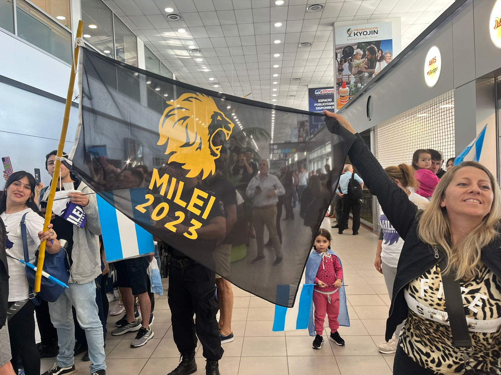 Así, minutos después de haber bajado del avión, Milei salió por el ingreso principal y allí fue recibido por una marea de gente que ya lo esperaba desde muy temprano con bombos, banderas y los clásicos cánticos: “La casta tiene miedo” , “Que se vayan todos” y “El domingo cueste lo que cueste”.