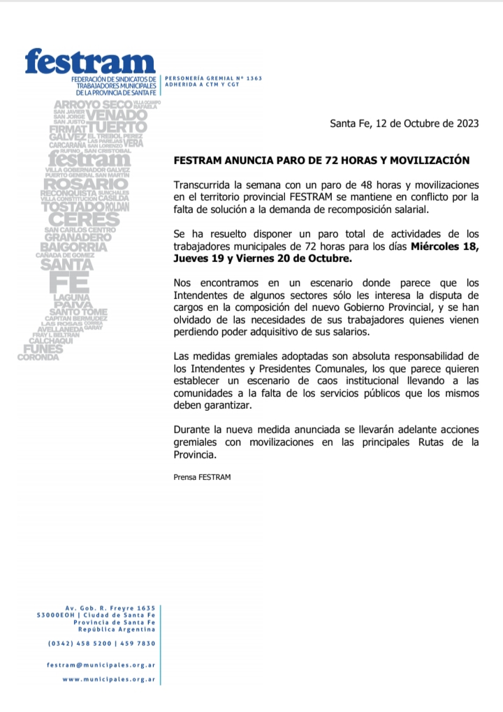La Asociación de Obreros y Empleados Municipales de Funes (ASOEM) comunicó anoche su decisión de adherir al paro de 72 horas que lanzó FESTRAM en toda la provincia de Santa Fe.
