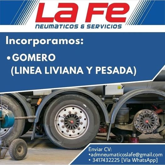 Neumaticos LA FE está en busca de 2 nuevos empleados con experiencia comprobable para área/rubro de la Gomería (línea liviana y pesada).