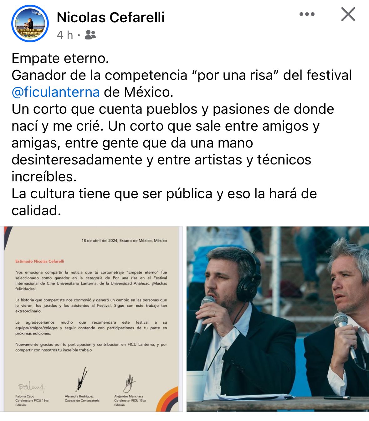 El trabajo audiovisual independiente es posible gracias a la pasión que cada protagonista le pone, porque plata suele haber muy poca. Y parte de ese trabajo arduo, a puro pulmón, con la ayuda de amigos, conocidos y demás fue el resultado del cortometraje “Empate eterno”, dirigido por el funense Nicolás Cefarelli, que se acaba de alzar con el premio “por una risa” en el Festival Internacional de Cine Universitaria Lanterna de México.