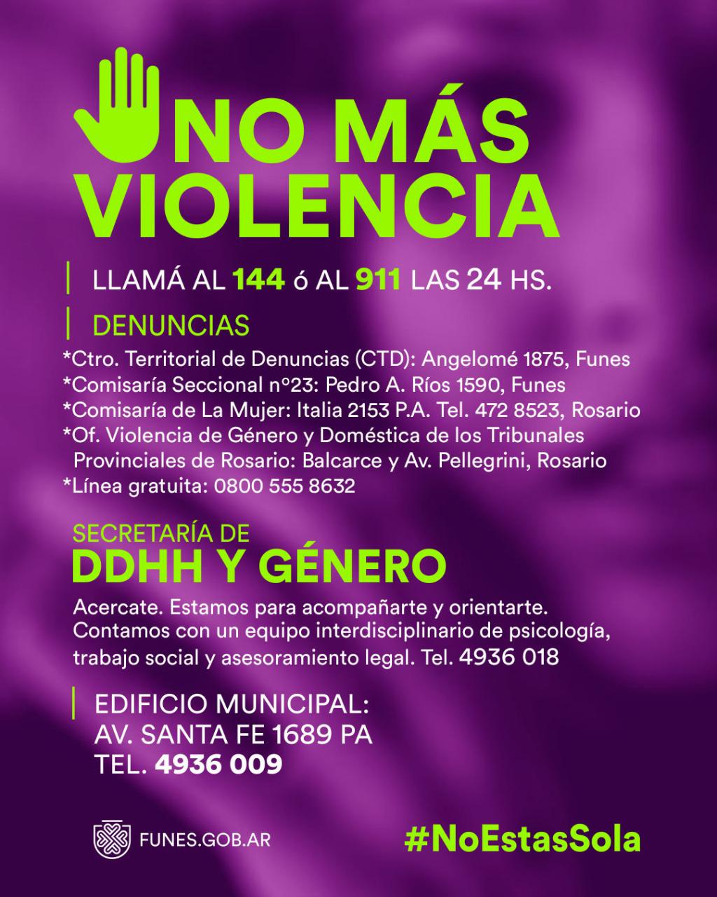 Por otra parte la Municipalidad de Funes cuenta la secretaría de DDHH y Género que cuenta con un equipo capacitado para acompañar y orientar a víctimas de violencia de género. Además de un equipo interdisciplinario de Psicologología, Trabajo Social y Asesoramiento Legal, podés comunicarte al 4936018.
