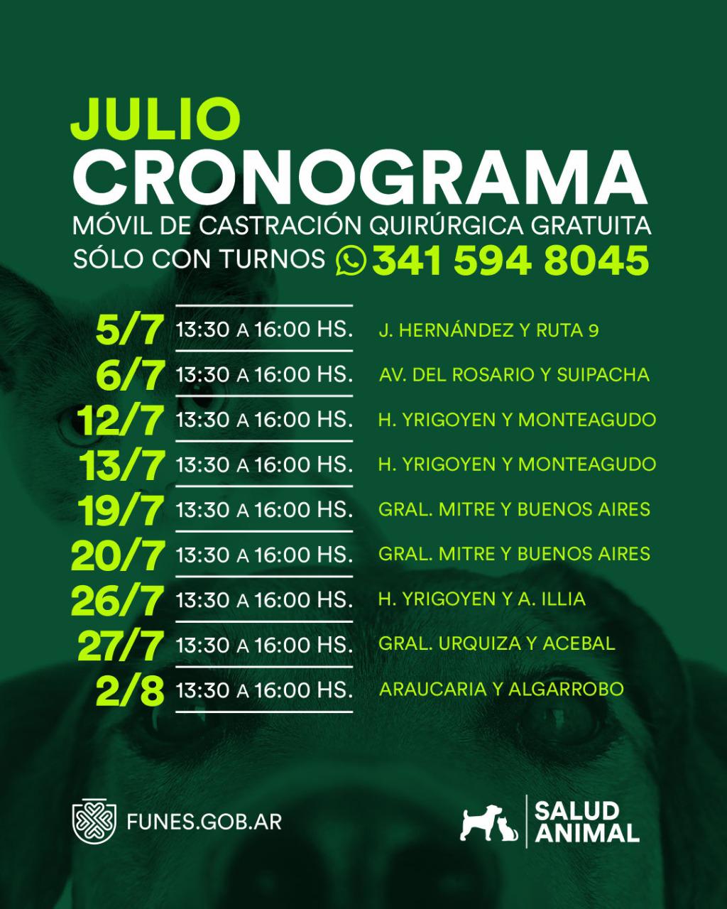 La secretaría de Salud Animal informó sobre las nuevas fechas del mes Julio para la atención veterinaria gratuita. Como todos los meses recorrerán diferentes puntos de la ciudad de Funes.
