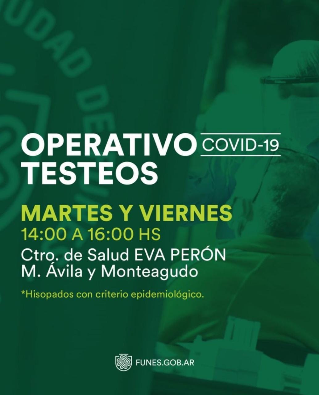 El Gobierno de Funes informó a través de sus redes sociales que el Operativo Testeos sólo funcionará los martes y viernes de 14 a 16.