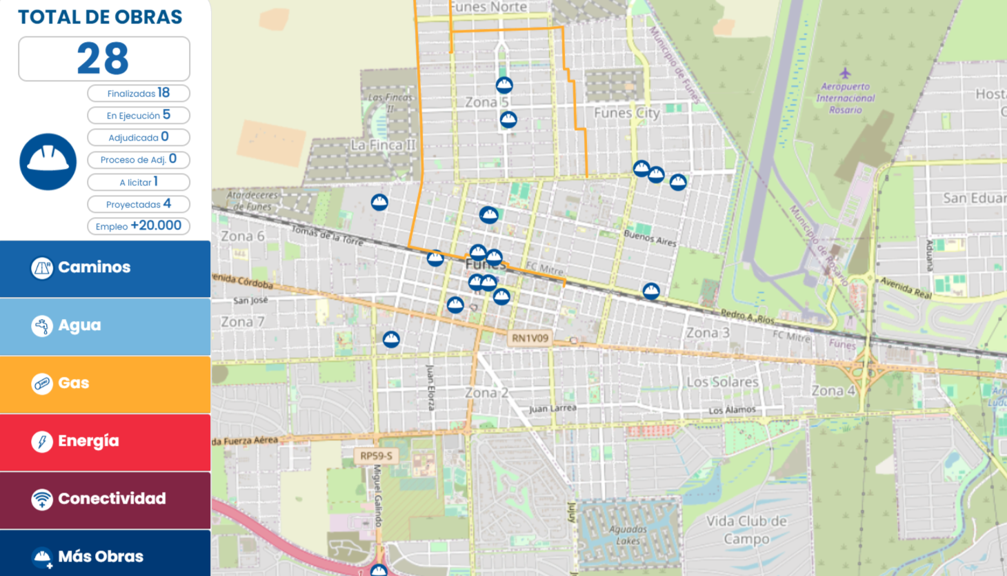 Desde entonces, a través de esta herramienta, se pudo corroborar que, en lo que respecta a Funes, el total de obras durante el período 2019-2023 es de 28, de las cuales 18 ya fueron finalizadas, cinco están en ejecución, cuatro quedan por licitar y una proyectada. Además, no hay ninguna adjudicada ni en proceso de adjudicación.