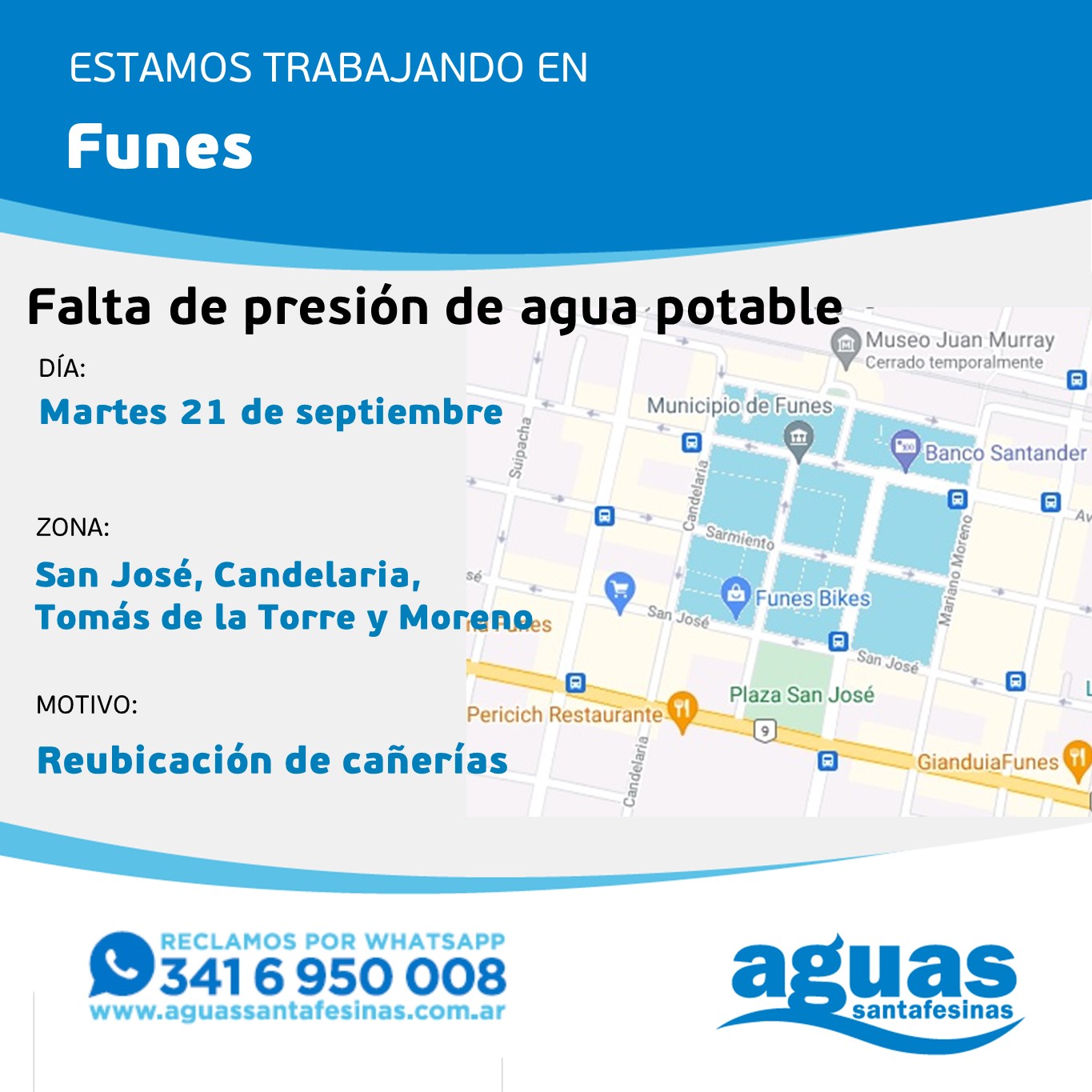 La oficina de Aguas Santafesinas informó que mañana martes, el servicio de agua potable estará con baja presión entre las 9 y las 15.30 por trabajos de reubicación de cañerías de agua potable.