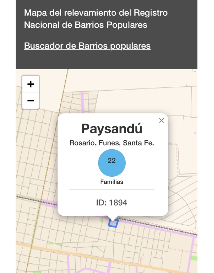 El Ministerio de Desarrollo Social, a través de la Secretaría de Integración Socio Urbana, lleva adelante el Registro Nacional de Barrios Populares , también conocido como “ReNaBaP ”. El mismo ofrece un mapa donde muestra todos los puntos que se engloban bajo dicha categoría en todo el territorio nacional. En él se puede ver que, con respecto a Funes, Nación tiene registrado que solo 22 familias forman parte de barrios populares.