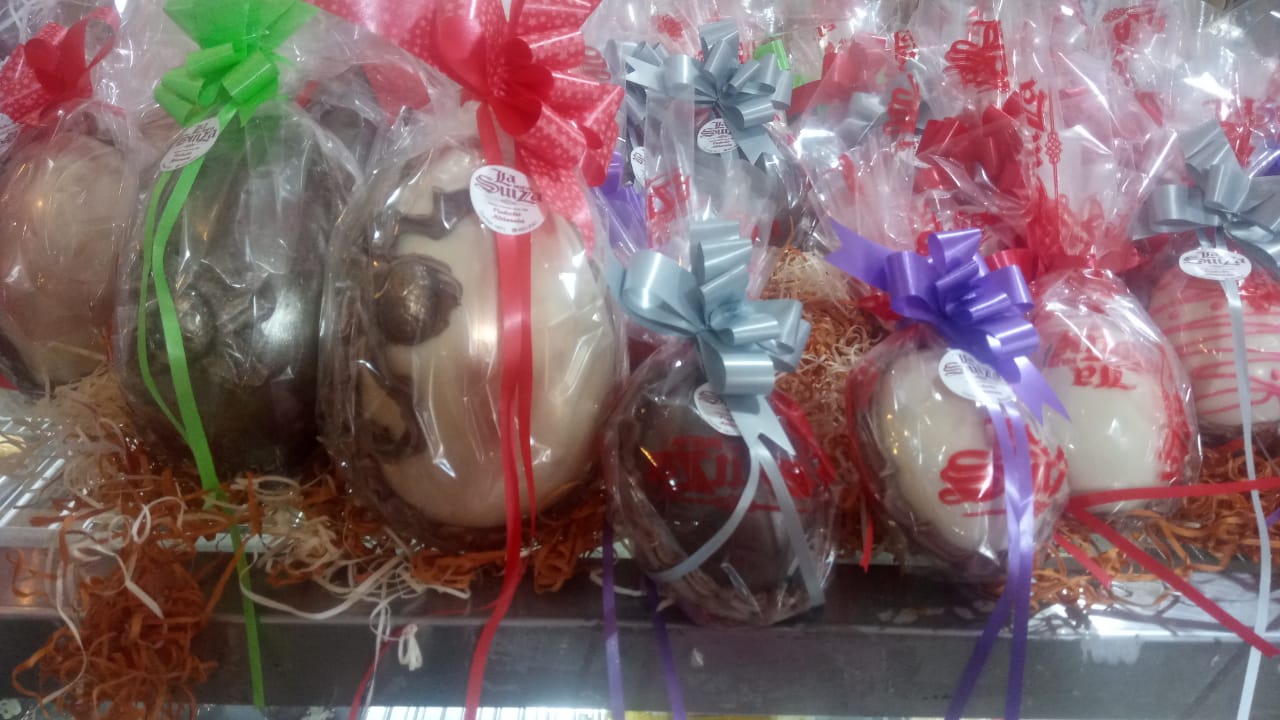 La Nueva Suiza tiene disponible en su local dos tipos de huevos, n° 10 y n° 12, además de conejos, todos rellenos con confites y bombones, los más grandes rondan los 850 pesos. Por otro lado comprando cualquier producto en la panadería pueden obtener un número para el sorteo de un huevo de chocolate, y por las redes sociales de Instagram sortearán una rosca.