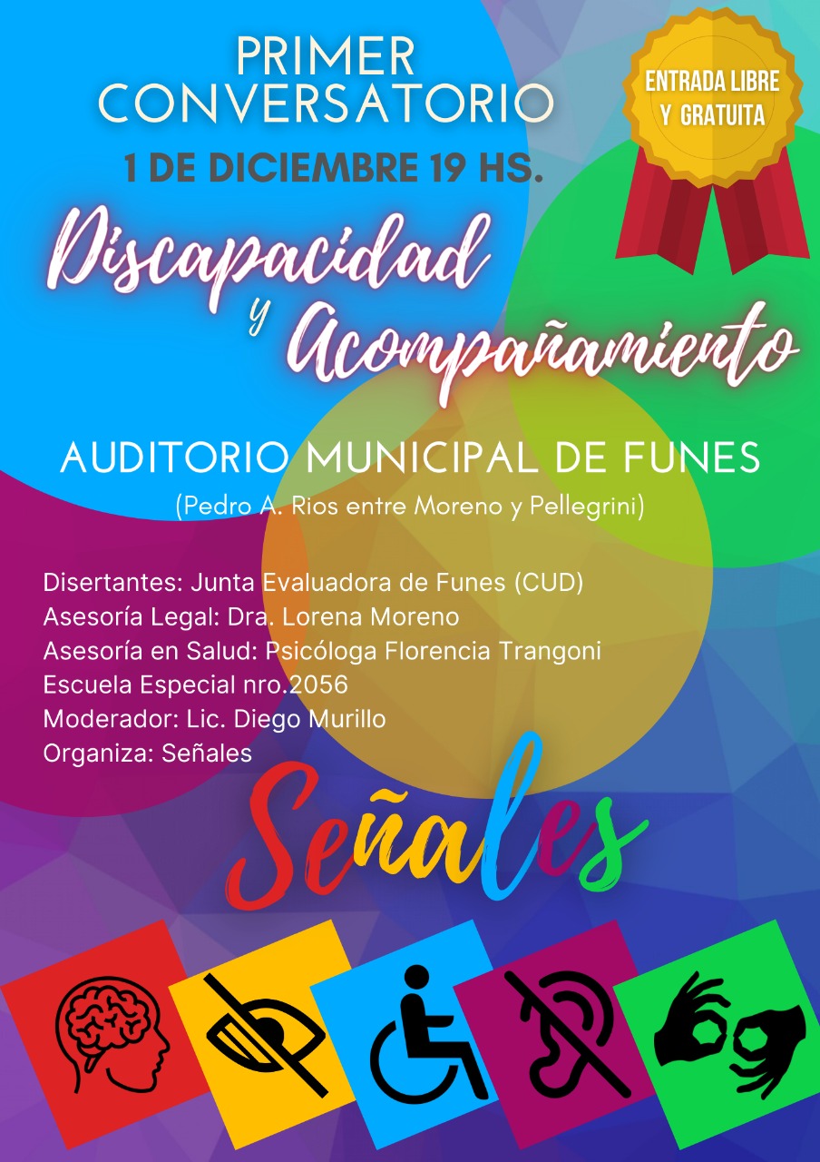 El Centro del Discapacitado de Funes organizó junto a otras instituciones un conversatorio sobre discapacidad y acompañamiento. Se realizará el 1 de diciembre a las 19 en el Auditorio Municipal, ubicado en calle Pedro A. Ríos al 1500, con entrada libre y gratuita.