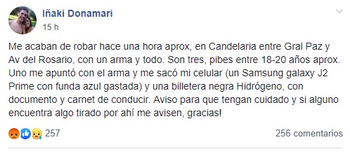 Lo que se destaca en la información es que la policía había intensificado su patrillaje porque en el grupo de Facebook llamado “Funes, mi ciudad” un usuario había comentado ser víctima de un robo por parte de tres sujetos armados. El robo “denunciado” se había llevado a cabo en Candelaria y General Paz.