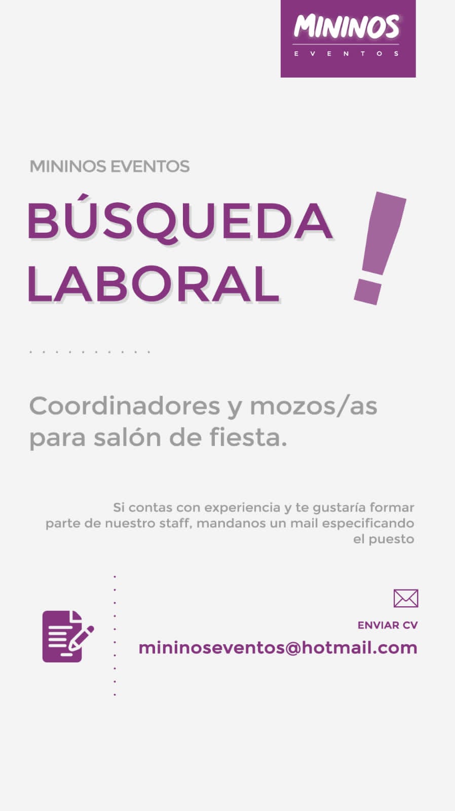 Mininos Eventos busca coordinadores y mozos o mozas para su salón de fiesta. Si contas con experiencia o te gustaría formar parte de su Staff envía tu Curriculum por mail a mininoseventos@hotmail.com y especifica el puesto por el cual estás interesado.