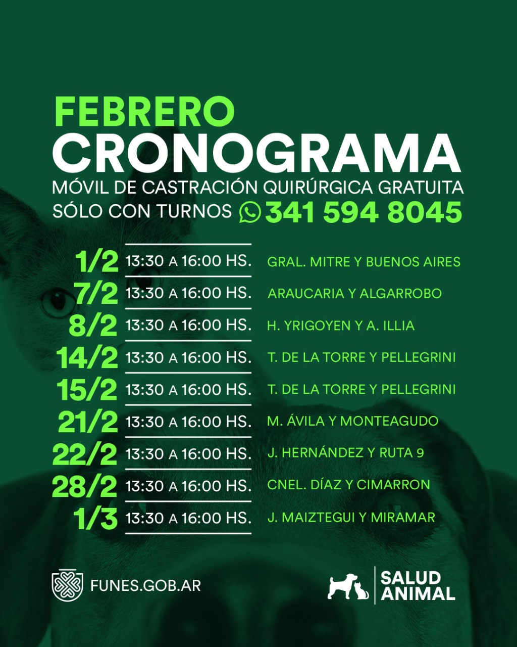 El área de Salud Animal de la Municipalidad de Funes dio a conocer el cronograma completo, con fechas y lugares correspondiente al mes de febrero para brindar sus servicios gratuitos de consultas, desparasitación y vacunación, además de la castración que se podrá acceder a ella sólo con turno previo.