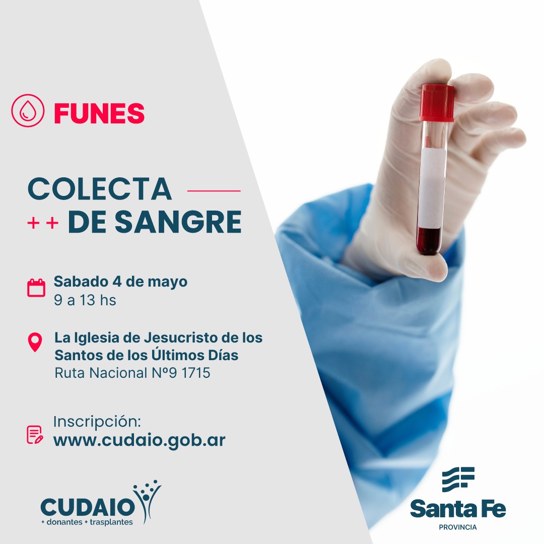 Este sábado se realizará en Funes una nueva colecta de sangre, esta vez Cudaio se une a la Iglesia de Jesucristo de los Santos de los Últimos Días, donde se realizarán las extracciones.