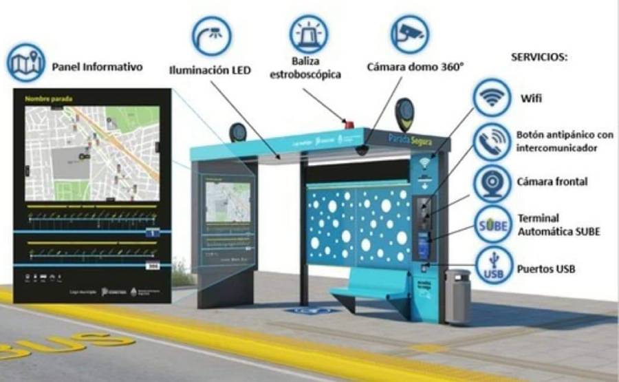 Este sistema, el cual ya está instalado en la provincia de Buenos Aires, implica la colocación en las paradas de colectivo de un intercomunicador conectado al centro de monitoreo, cámaras domo 360 con reconocimiento facial, baliza estroboscópica, altavoz y puertos para carga de celular.