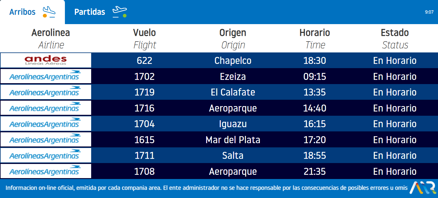 En tanto, se espera que durante la jornada lleguen vuelos desde los mismos destinos mencionados anteriormente, con la novedad de uno de la empresa Andes proveniente de Chapelco previsto para las 18.30 horas.