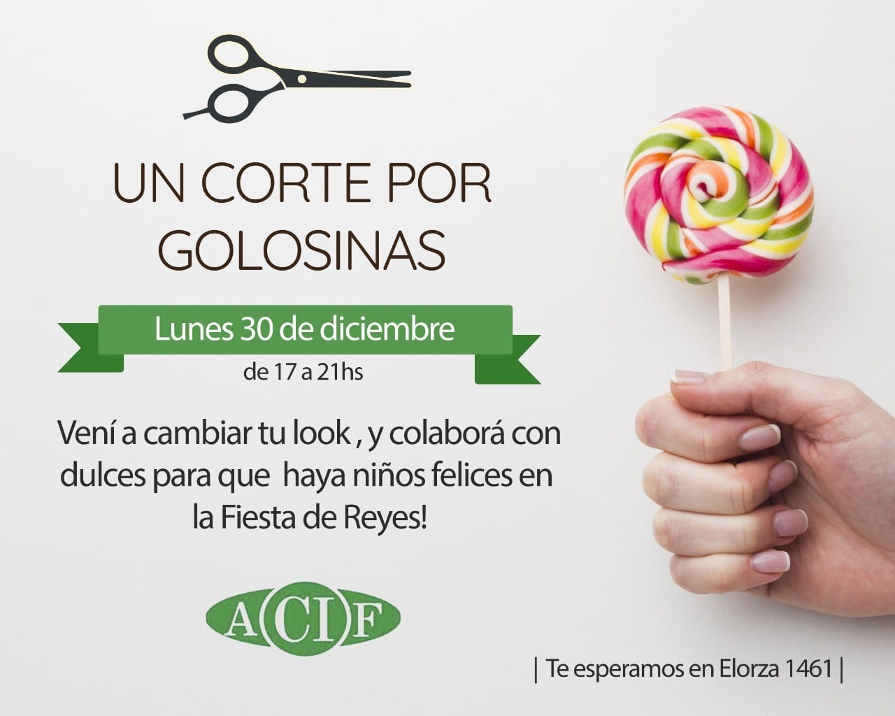 Peluqueros/as y barberos se encontrarán todo el día en la sede ACIF donde trabajan a cambio de caramelos.Niños y adultos podrán “pagar” un corte de pelo con caramelos, la comisión directiva de ACIF decidió realizar una campaña con el objetivo de juntar golosinas y donarlas para el 6 de enero.