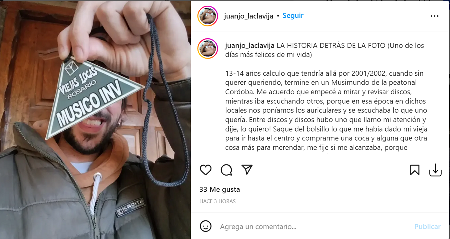"13-14 años calculo que tendría allá por 2001/2002, cuando sin querer queriendo, termine en un Musimundo de la peatonal Cordoba. Me acuerdo que empecé a mirar y revisar discos, mientras iba escuchando otros, porque en esa época en dichos locales nos poníamos los auriculares y se escuchaba lo que uno quería. Entre discos y discos hubo uno que llamo mi atención y dije, lo quiero! Saque del bolsillo lo que me había dado mi vieja para ir hasta el centro y comprarme una coca y alguna que otra cosa más para merendar, me fije si me alcanzaba, porque tampoco era mucho y cuando ví que llegaba, lo gaste en ese disco. No me olvido más que la vuelta a casa fue con una alegría terrible", así empieza el relato que subió ayer a su cuenta de Instagram Juanjo Gregorio, voz de la banda funense La Clavija.